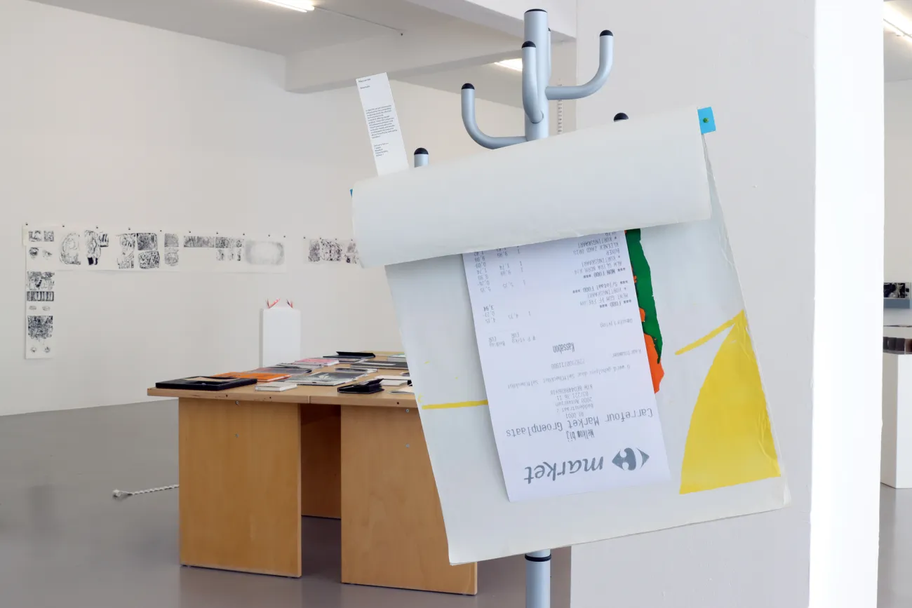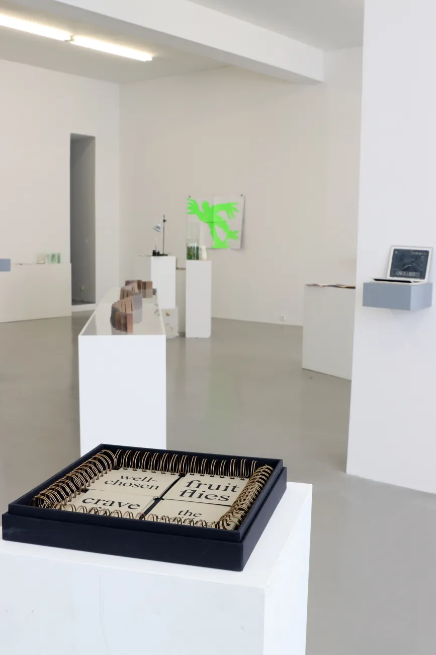 Dementsprechend vereint die Ausstellung eine große Bandbreite von Bücherformaten: darunter das Quadropoden Forschungshandbuch von Lui Kohlmann, Zersetzung, einen Beitrag zum Kreislauf des Lebens von Jana Thiel, das Textbuch Pferde von Armin Wischkony, die entfaltbare Zeichnungsserie Mystic Truth / Cosby Show von Alice Gericke, das temporäre Kissenbuch Weiße Nacht von Rui Diao und Toilet paper, ein Zusammenspiel von Zeichnung, Text und Textur von Bolin Chen. Die Publikationen umfassen außerdem Sprachspiele, Zeichnungsbücher, Materialforschungen, visuelle Experimente mit Druckmaschinen, inhaltliche Collagen, Archive, Graphic Novels, Pop-Ups, Leporellos, entfaltbare Plakate sowie Erzählungen aus freien Text- und Bildfolgen.