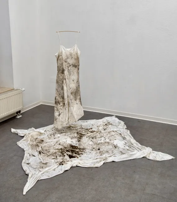 In the process Kawanishi put on a dress that she sewed by herself and drew her movement with the whole body on a piece of fabric using soil and glue. As fabrics rub against each other, stretching and shrinking, the painter herself is painted. Challenging the neutrality of the relationship between paintings and painter, she presented a situation in which the perspective of painting and the perspective of being painted work as a unity, they enter into a tension-filled connection.