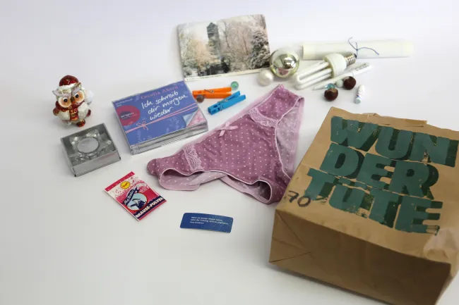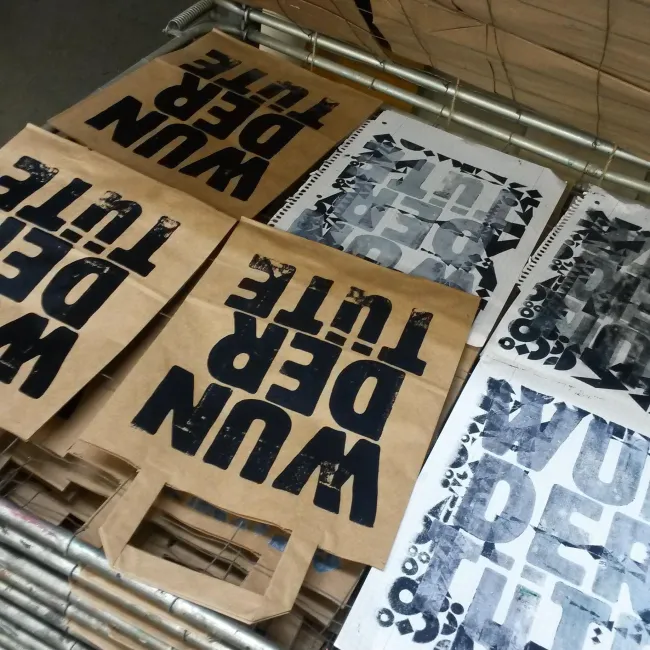 Im November 2016 war es bei einem Ausstellungstransport zu einem Unfall gekommen, den ich nicht bemerkt hatte. Mir wurde Fahrerflucht vorgeworfen. Um einen Anwalt bezahlen zu können, startete ich die Wundertütenaktion. Von Freund*innen sammelte ich aussortierten Kram ein - Kerzen, Hefte, Kitsch, Spielzeug, Bürozubehör, Schmuck, Sonnenbrillen. Ich bedruckte im Handsatz Papiertüten und füllte den ganzen Krempel meiner Freund*innen thematisch sortiert in Wundertüten. In der Maria Stuart Tüte beispielsweise war eine Reclam-Ausgabe von Schillers gleichnamigen Drama sowie eine enthauptete Barbie. Beiligend in jeder Wundertüte war ein klienes Künstler*innennheft, das den Entstehungshintergrund der Wundertüten erklärte und eine individuell gestaltete Doppelseite enthielt, die auf den spezifischen Inhalt der Wundertüte einging.